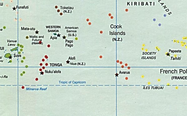 The Aitutaki lagoon is totally encircled, and only very shallow passages connect it to the open ocean. Only near the harbour, the Arutanga passage is deep enough to let small boats through. Ferries and ships must anchor outside the harbour. |